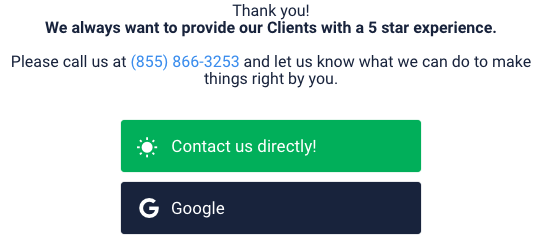 Please note that by changing the 'Company Name' field, you will be altering what your customers see wherever we place your company name (which will be included in all notifications we send out). Also note that the 'Company Phone number' field is a customer facing contact that will be displayed for customers with concerns (see image below). If your customer submits the 'Negative' or 'Neutral' sentiment in the pulseCheck, your 'Company Phone number' will be displayed for that customer to contact you directly before continuing with the pulseCheck review.
