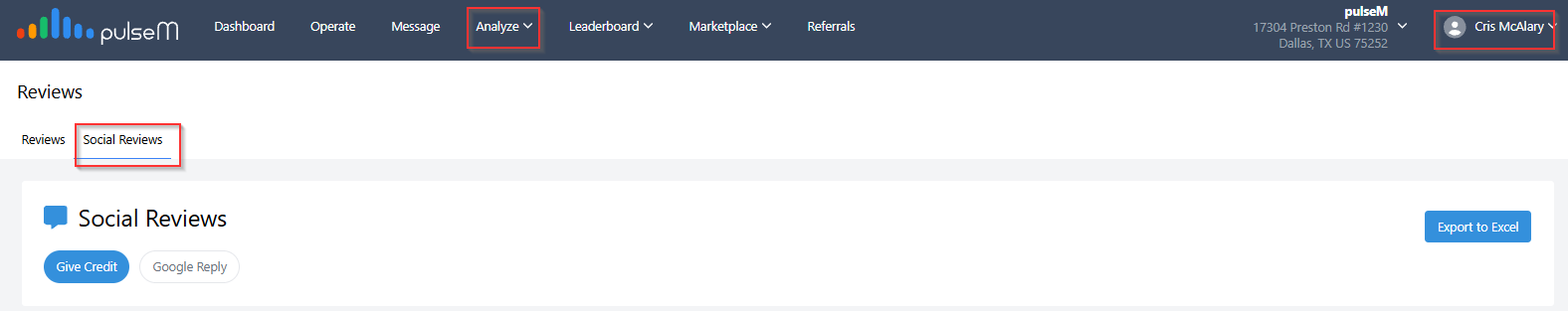 The Social Reviews section displays reviews from your Google My Business and Facebook business pages, enabling you to Give Credit to your technicians. To view the reviews, begin by logging in to your pulseM account and navigate to ( Analyze > Review > Social Reviews).