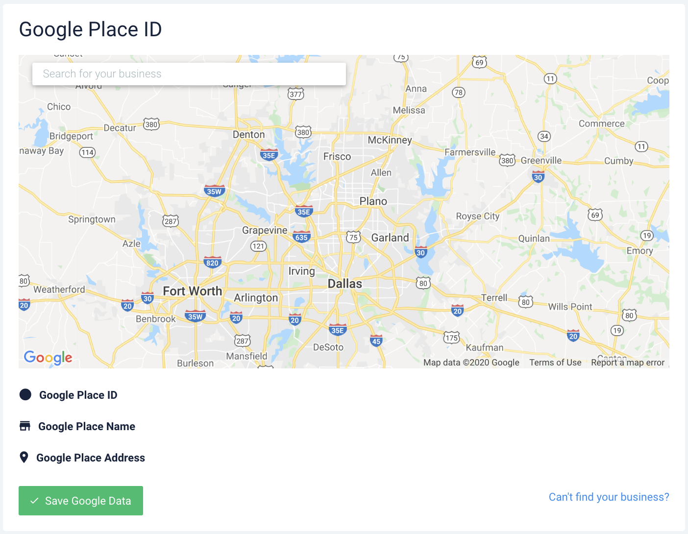 Connecting Google Place ID enables us to route your customers to leave a review for you on Google. Inside the Google Place ID tile, start by searching for your business name in the Google Place ID finder under Profile Icon > Settings -> General -> Connect Social Media .