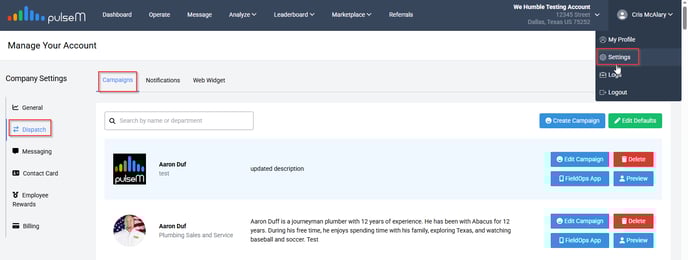 You can view your Campaigns by first logging into your pulseM account. Next, navigate to ( Settings > Dispatch > Campaigns . ) Here, there are several functions you can perform.