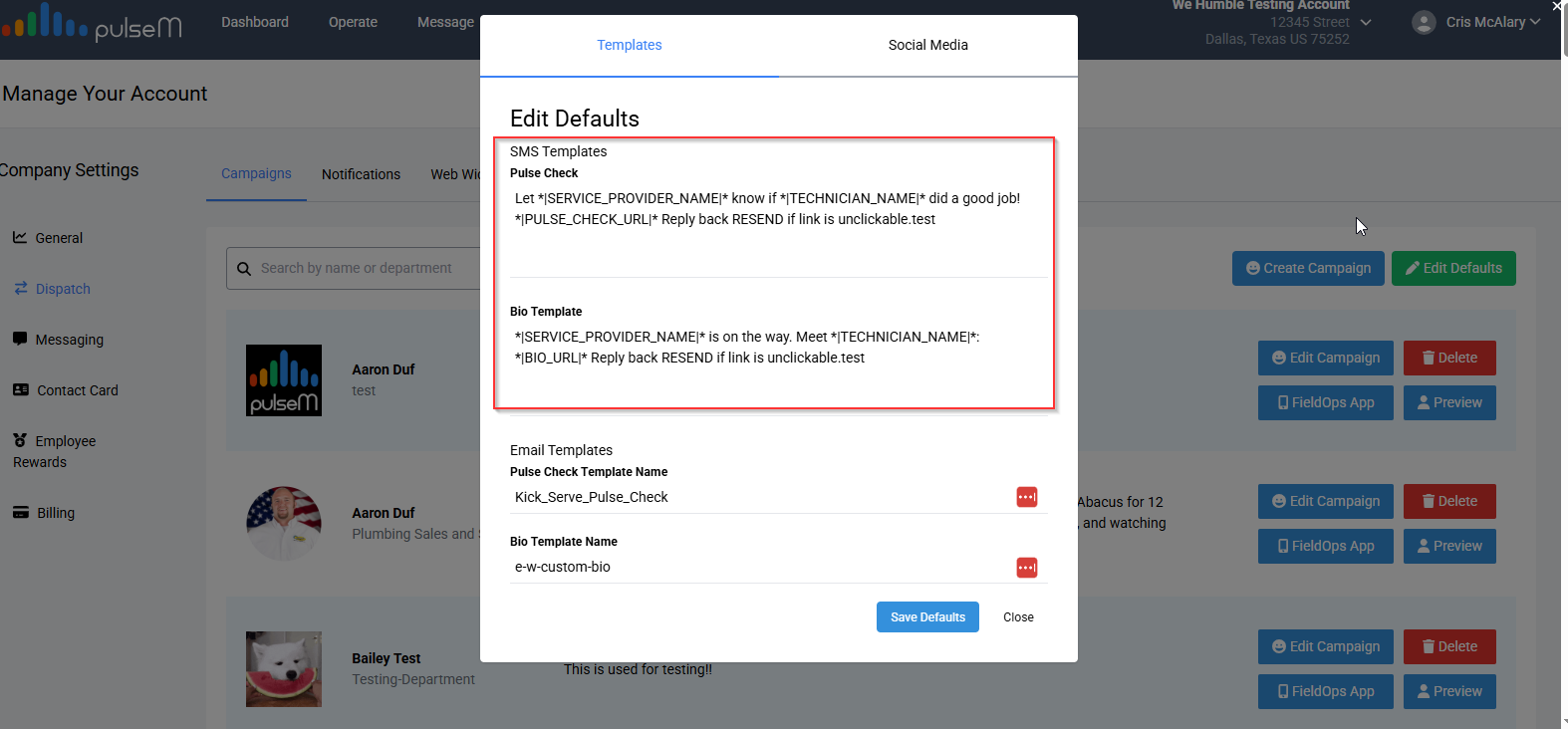 Replace any of the text under the pulseCheck and/ or Bio SMS templates