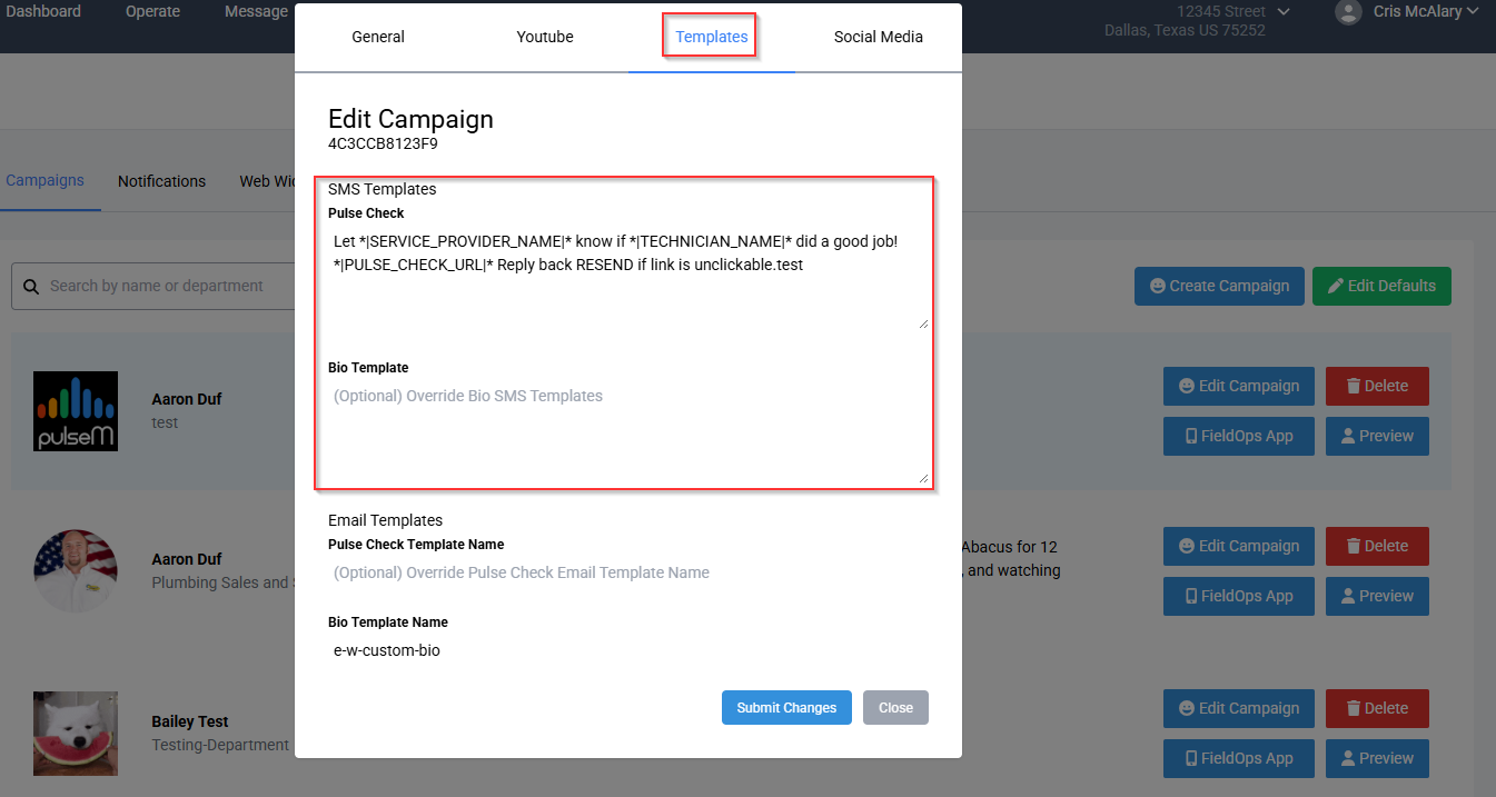Templates: The 'Templates' tab enables you to edit the Bio or pulseCheck message. (See step 5)