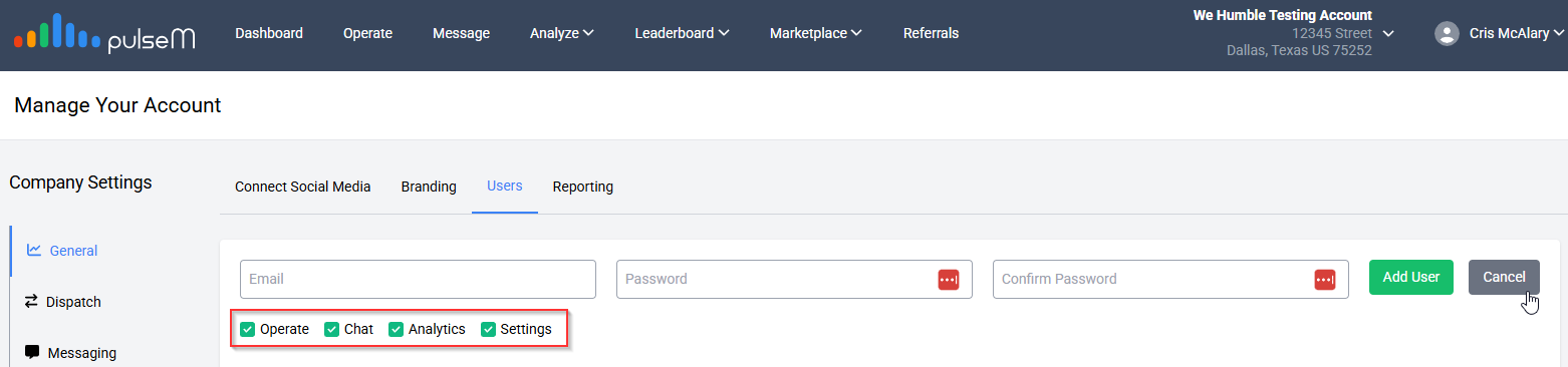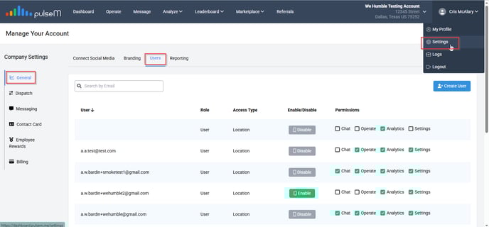 The 'Users' section enables you to add dispatchers and chat users to your pulseM account and configure their access. To add a 'User' or manage their access, begin by logging in to your pulseM account and navigating to ( Settings > General > Users).