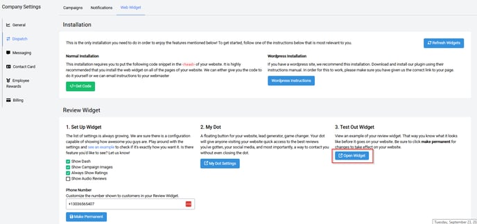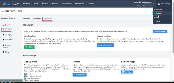 In this article, you will find how to install the Review Widget, then Set Up Widget to configure review display, and Test Out the widget. To find the source code for the Review Widget, begin by logging into your pulseM account, and navigate to ( Settings > Dispatch > Web Widget ).