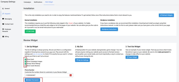 To configure the review display on all widgets, you may choose to check the boxes for Show Campaign Images, Always Show Ratings, Show Audio Reviews, and Show Dash (visit our Dash article for more on the Dash). Once complete, click the blue Make Permanent button.