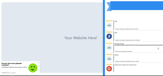 The Review Widget is fixed on your website page. This means that it will automatically display on the chosen pages and will not float with the page as you scroll up or down. This widget will display a feed of every positive pulseCheck and social media review that your company approves, as well as a total review count and 5 star badges for the sites you have 5 stars on.